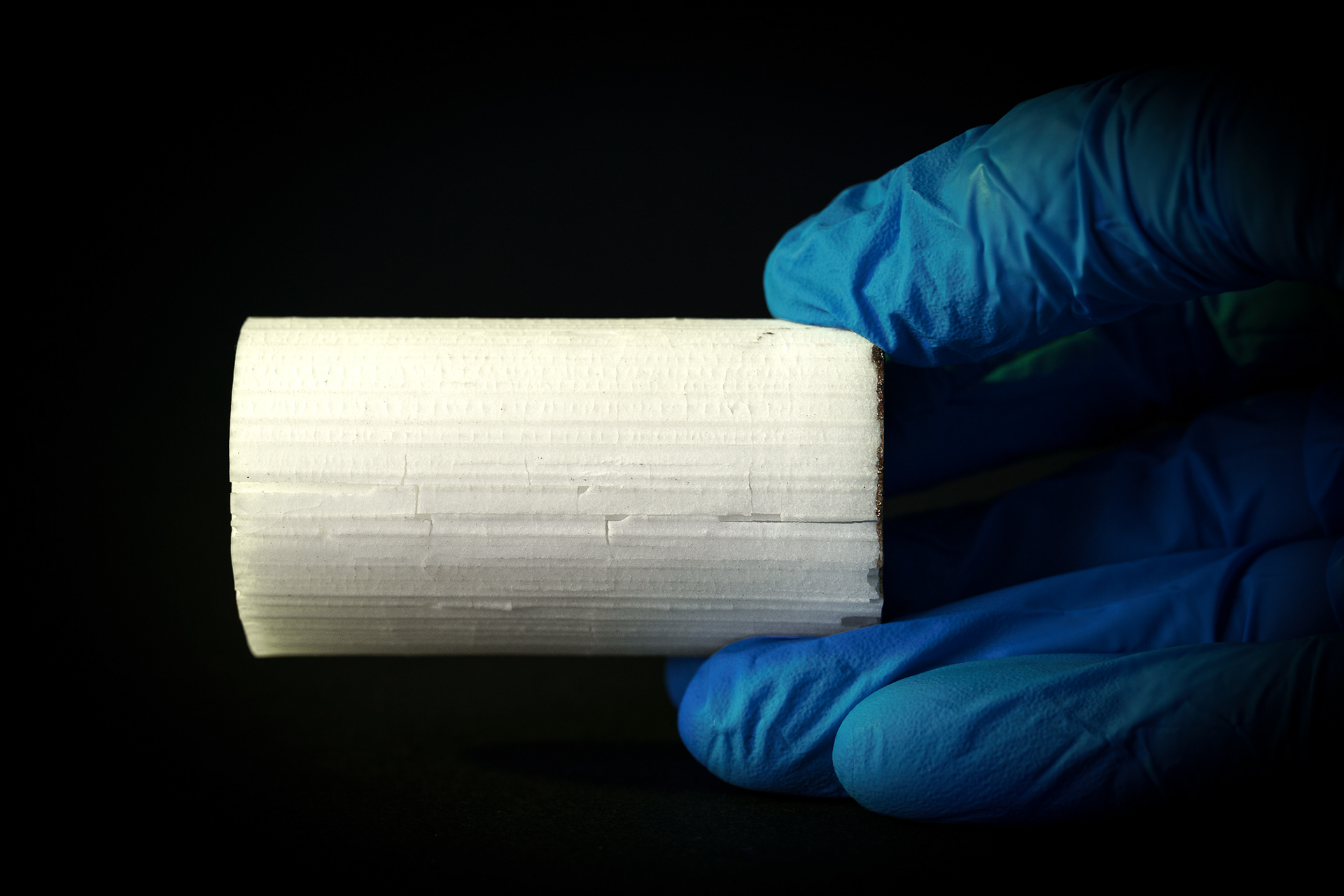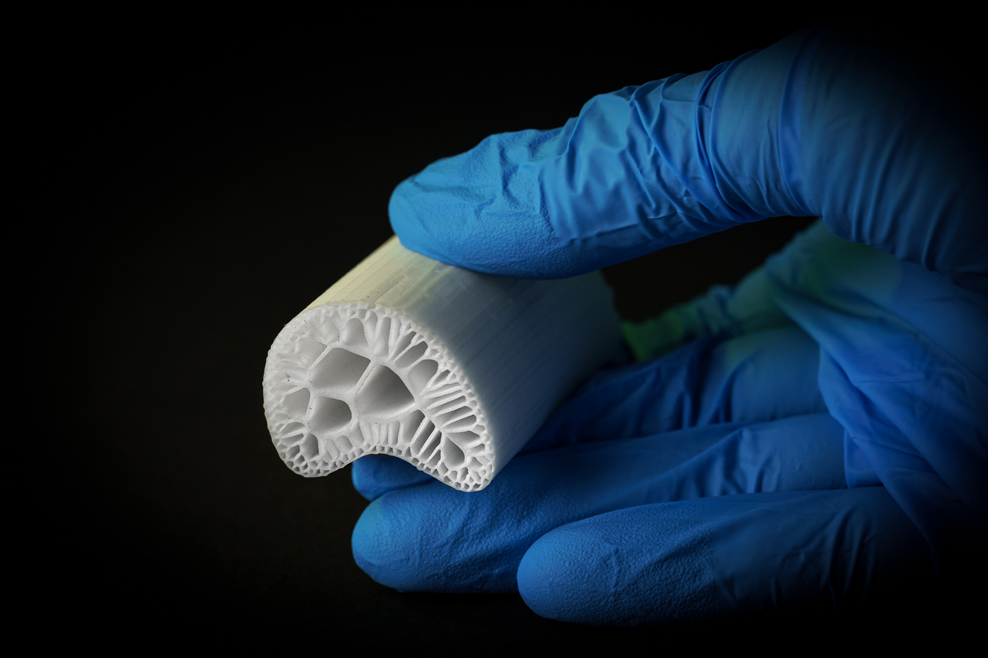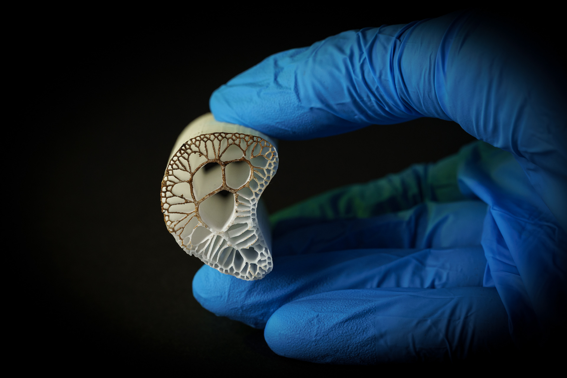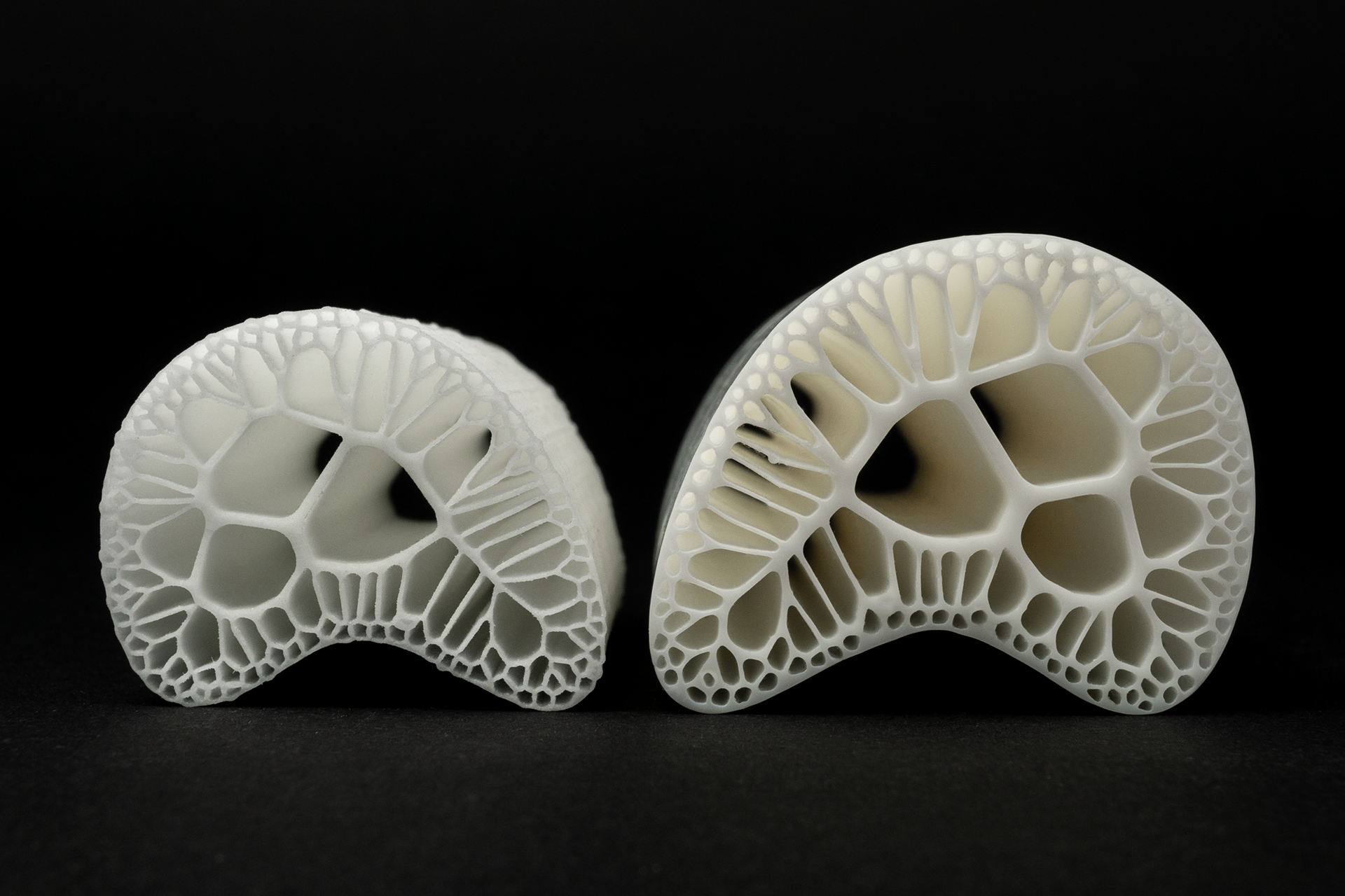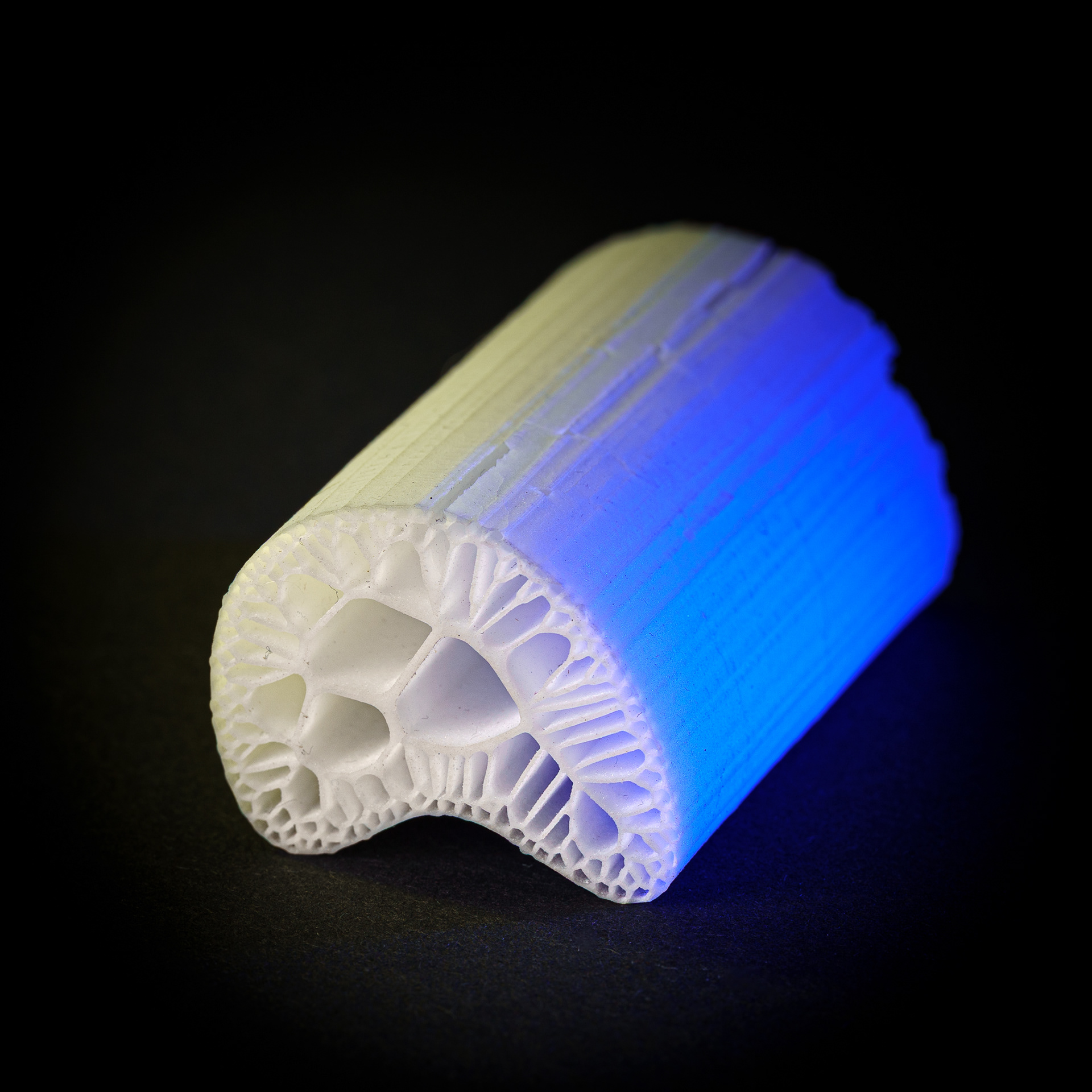 For the "porcelain bones" project, an area defined by a boundary curve was divided into cells using a Voronoi diagram. The focus is on lightweight design and material savings. Similar principles can be found in nature, such as in the cellular structures of tissues, the leaf veins of plants, or the hexagonal honeycombs of bees. In these cases, the space is efficiently partitioned to optimize the use of resources. A 3D-printer printed the data in porcelain, thus replicating a complex natural structure inspired by the mathematics of the Voronoi diagram.